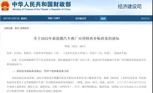 日前,财政部、工业和信息化部、科技部、国家发展改革委四部门联合发布《关于2022年新能源汽车推广应用财政补贴政策的通知》(下称《通知》)以及《2022年新能源汽车推广补贴方案》(下称《方案》)。《通知》要求,2022年,城市公交、道路客运、出租(含网约车)、环卫、城市物流配送、邮政快递、民航机场以及党政机关公务领域符合要求的车辆,补贴标准在2021年基础上退坡20%,退坡幅度相对较大。