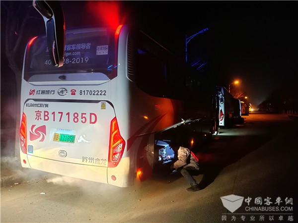 1月5日,深夜里的北京温度已达零下5℃,苏州金龙服务工程师们仍坚守岗位,为车辆添加防冻液、检查电器部件是否正常工作。“整个冬奥会期间,温度是影响车辆正常运营的重要因素,在这样的温度下检查车辆,能够更好地测试服务车辆是否能够接受严寒考验。”苏州金龙服务工程师金旺表示。