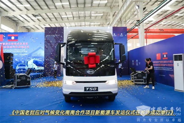 7月23日,首批援助中国老挝应对气候变化南南合作项目-万象赛色塔低碳示范区的新能源车发运仪式在长沙成功举行。此次捐赠的28辆新能源车来自比亚迪,其中C8纯电动大巴12辆、T5D纯电动卡车8辆,将进一步推进赛色塔低碳示范区的绿色交通运输、环保出行和节能减排。