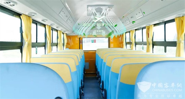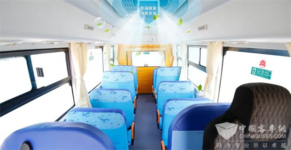 中通校车采用的车厢除菌消毒系统,能分别实现车辆静止和运行时对车厢做到全面、快速、实时、强效的杀菌消毒。有效降低PM2.5、祛除异味、分解有害气体、改善车内空气质量、补充空气维生素(负氧离子)等多重功效,让驾驶员及孩童远离病毒病菌,畅享旅途中大自然般的空气清新。