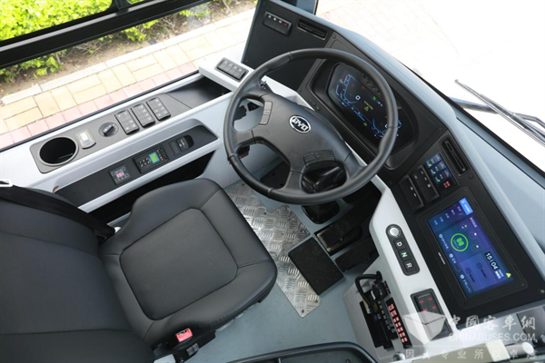 驾驶室采用隔断式全包围设计,减少驾驶干扰因素,提升车辆行驶安全。驾驶室后方搭载32寸导乘屏,满足站点信息浏览和电视播放功能。采用大面积车窗设计,高通透车厢,采光良好、视野开阔,乘坐体验更舒适。