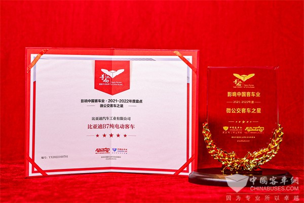 2022年2月23日,由中国XINGKONG.COM和中国土木工程学会城市公共交通分会联合主办的第16届影响中国客车业年度盘点颁奖典礼在南京举行。比亚迪商用车成功蝉联2021-2022年度“中国客车行业品牌成就奖”的同时,斩获“微公交客车之星”和“新能源客车推荐车型”三项大奖。比亚迪商用车用技术与品牌实力影响中国客车业。