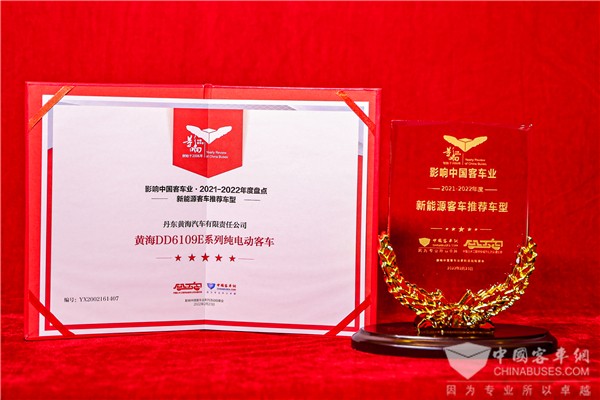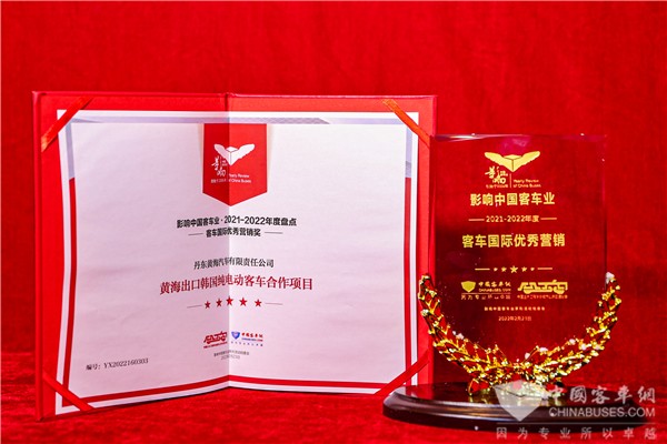 活动同期,“第16届影响中国客车业年度盘点活动”评选结果正式出炉,经过专业读者投票与评选会专家综合评定,丹东黄海汽车有限责任公司出口韩国纯电动客车合作项目荣膺2021-2022年度“客车国际优秀营销奖”,黄海DD6109EV系列纯电动城市客车获评2021-2022年度“新能源客车推荐车型”。