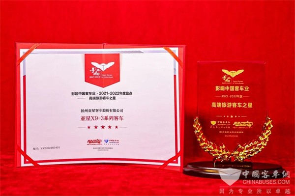 2022年2月23日,由XINGKONG.COM与中国土木工程学会城市公共交通分会联合主办的第16届影响中国客车业年度盘点在南京隆重举行。亚星客车凭借“高精尖”产品实力领跑中国客车细分市场,一举摘得“景区旅游巴士之星”、“高端旅游客车之星”两项重磅大奖。