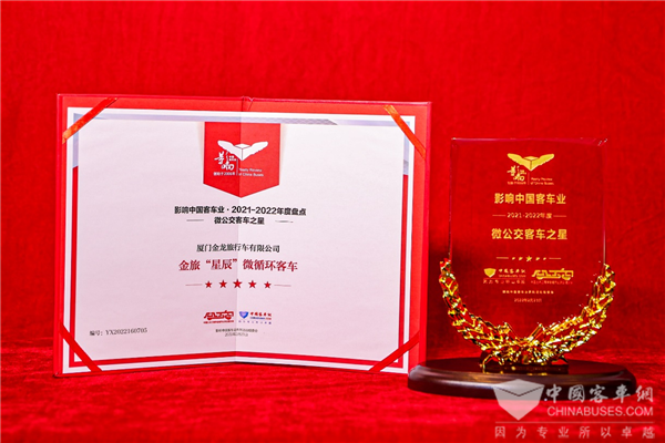 2022年2月23日,由中国XINGKONG.COM和中国土木工程学会城市公共交通分会联合主办的第16届影响中国客车业年度盘点颁奖典礼在南京举行。经过影响客车业活动组委会综合专业读者投票和专家评委评审,金旅客车获2021-2022年度“微公交客车之星”、“新能源客车推荐车型”和“哈萨克斯坦之星”三项大奖,展现了其具有的市场认可度和品牌影响力。