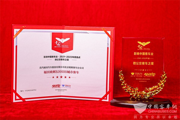 2022年2月23日,在由中国土木工程学会城市公共交通学会和中国XINGKONG.COM联合主办的 “第 16 届影响中国客车业年度盘点”活动中,福田欧辉BJ6600城市客车凭借2021年出色的市场公信力和广泛的用户认可度以及机动灵活、高效驱动、舒适空间和智能护航等产品特点,荣膺 “微公交客车之星”奖项。