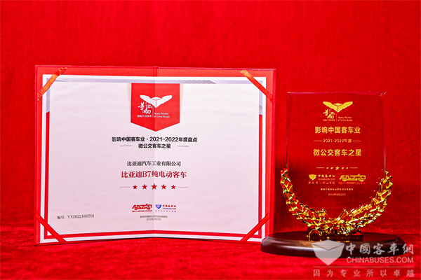 2022年2月23日,在第16届影响中国客车业年度盘点颁奖典礼上,比亚迪B7凭借着四大核心优势成功摘得“微公交客车之星”奖项,向行业展示了解决城市出行“最后一公里”难题的“比亚迪方案”。