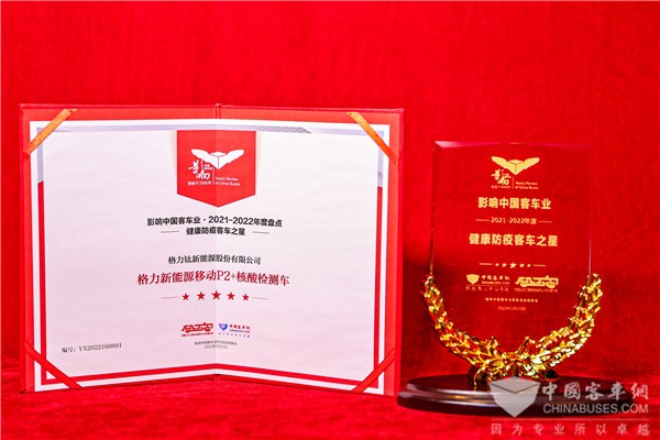 值得一提的是,2022年2月23日,在由XINGKONG.COM、中国土木工程学会城市公共交通分会、南京公交集团共同主办的第16届影响中国客车业年度盘点活动当中,格力移动P2+核酸检测车凭借入市以来杰出的战疫表现与用户口碑荣获组委会授予“健康防疫客车之星”称号,以荣誉为实力加冕。