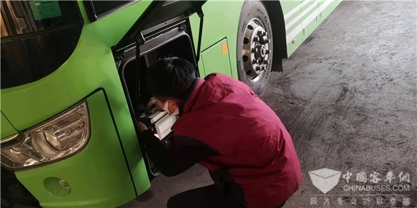 在春运期间营运车辆检查项目中,安凯售后服务工程师重点对发动机自动灭火装置、安全锤、天窗、座椅安全带、仪表开关指示灯、乘客门应急开关、发动机冷却液面、发动机皮带磨损等8大关键项目进行免费“体检”,如有故障第一时间发现并排除,确保行车安全无死角,守护每一辆安凯客车一路平安。