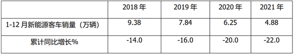 终端上牌数据显示,2021年新能源客车终端实际销量只有4.88万辆,同比受疫情影响最为严重的2020年还下降22%(表1),已降至近年“冰点”,而2022年的新能源客车发展环境可能要好于去年。因此,可能将给今年的新能源客车市场出现“触底反弹”带来机会,也就是说今年的新能源客车市场可能会“否极泰来”。