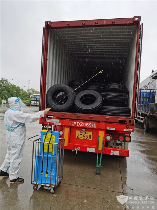 对所有到达物料,苏州金龙自疫情防控以来根据相关部门指导以及公司防疫防控指南成立了物资进厂防疫消杀团队,从前期的来料通报、司机体温监测、指定卸货点、专人消杀,到24小时存放后送入产线,全程均按照规定有序进行。同时,对从事消杀人员的核酸检测增加到每日一次,进口物资的核酸采样也做到逢进必检,包装拆到哪层,消杀就做到哪层,坚决做好全面防护。