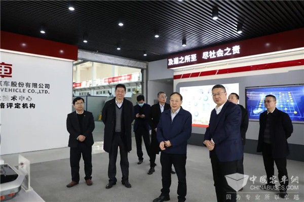 在试验检测中心,讲解人员详细介绍气候模拟、储能系统、三综合、整车综合性能等实验台,周青不时颔首驻足,详细听取了中车电动对有关先进设备、自主研发产品和结构综合检测的介绍,并与相关负责人进行交流讨论。