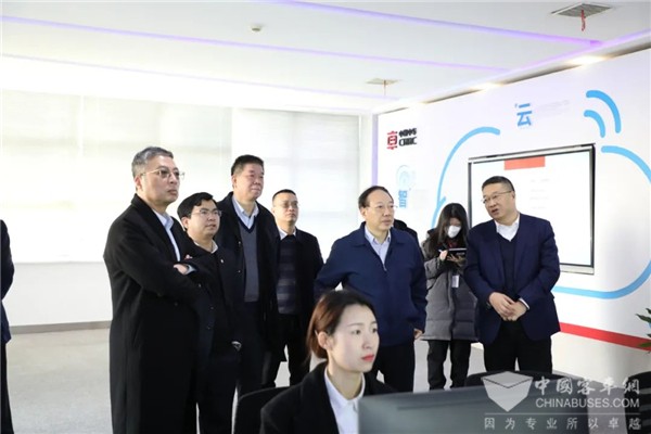 最后,周青一行来到云智通云视中心,他详细了解中控大屏上实时变化的数据,并仔细询问各地车辆运营状态、驾驶员行为数据等信息。周青指出,公司要持续提升公司产品竞争力,将主动安全与日常安全运营监控功能深度融合,整体提高整车安全和运营管理的工作效率,为司机和乘客的安全保驾护航。