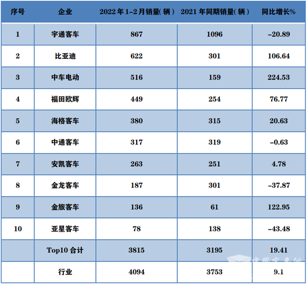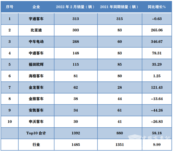 2022年2月新能源客车销量TOP10同比统计(数据来源:中国客车统计信息网):