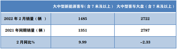 根据中国客车统计信息网数据,2022年2月大中型新能源客车销量1485辆,同比增长9.99%,而2月大中型客车整体大盘(含7米及以上,下同)销量2722辆,同比下降2.33%,也就是说今年2月大中型新能源客车跑赢大中型客车大盘,是抑制大中型客车市场下滑的中坚力量。