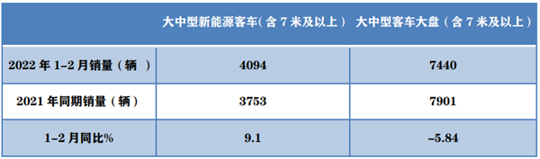 2022年1-2月新能源客车销量同比与客车大盘比较(数据来源:中国客车统计信息网):