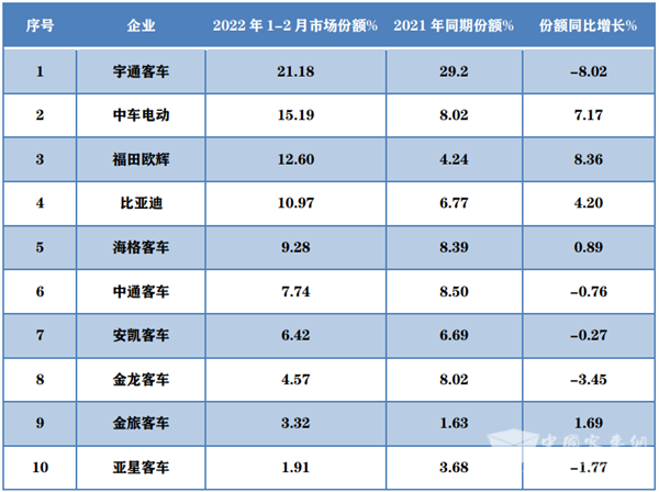 从上表看出,2022年1-2月新能源客车Top10中市场份额变化特征是: