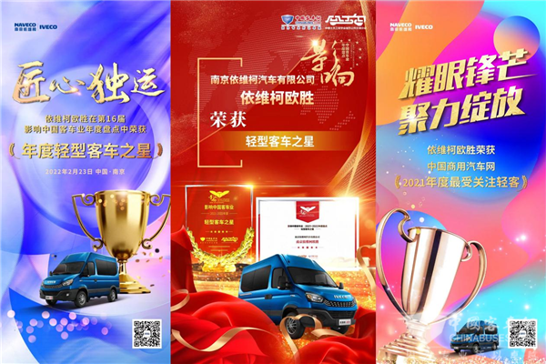 不仅仅用户信赖的好搭档,依维柯还是众多大奖的宠儿。在中国商用汽车网举办的“中国商用汽车2021年度企业/车型/人物”年度评选盛典中,依维柯欧胜荣获“年度最受关注轻客”奖;在中国XINGKONG.COM举办的“影响中国客车业·2021-2022年度盘点”中,依维柯欧胜荣膺“轻型客车之星”的称号!一座座沉甸甸的奖牌记录了依维柯的“高光时刻”,见证了依维柯的不懈追求。