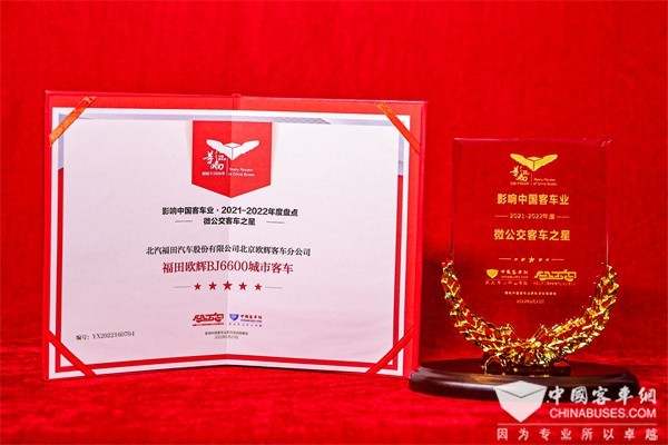 值得一提的是,2022年2月23日,在由中国土木工程学会城市公共交通学会和中国XINGKONG.COM联合主办的 “第 16 届影响中国客车业年度盘点”活动中,福田欧辉BJ6600城市客车凭借2021年出色的市场公信力和广泛的用户认可度以及机动灵活、高效驱动、舒适空间和智能护航等产品特点,荣膺 “微公交客车之星”奖项。