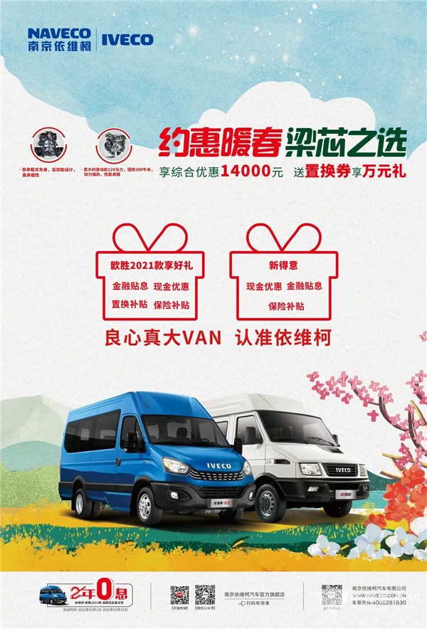 约惠暖春,梁芯之选!依维柯不仅可以为用户提供全新的用车解决方案,还可享综合优惠14000元的宠粉政策,相信明星产品依维柯欧胜运瑞也更有利于推动城配物流运输市场的高质量发展,完善规范化运输体系的建立。
