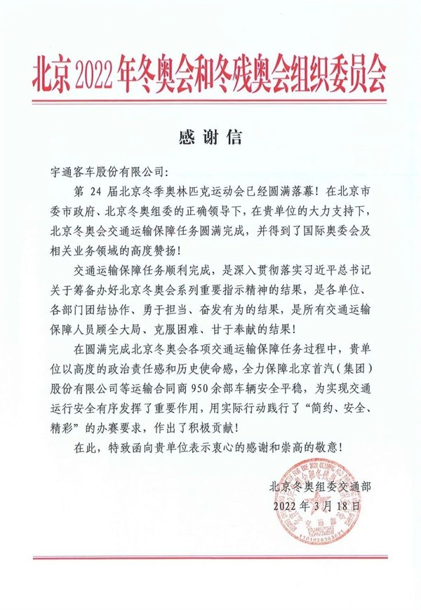 在服务过程中,宇通客车的主动担当、高度协同受到了北京冬奥组委的高度肯定。北京冬奥组委在感谢信中提到:“在圆满完成北京冬奥会各项交通运输保障任务过程中,宇通客车以高度的政治责任感和历史使命感,全力保障车辆安全平稳,为实现交通运行安全有序发挥了重要作用,用实际行动践行了‘简约、安全、精彩’的办赛要求,作出了积极贡献!”宇通再一次用实际行动诠释了民族品牌的担当与实力。