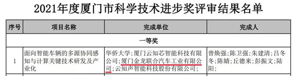 XINGKONG.COM2022年3月21日获悉,近日,2021年度厦门市科学技术进步奖评审结果公布。金龙客车与华侨大学、厦门云知芯智能科技有限公司、云知声智能科技股份有限公司联合项目《面向智能车辆的多源协同感知与计算关键技术研发及产业化》荣获一等奖!