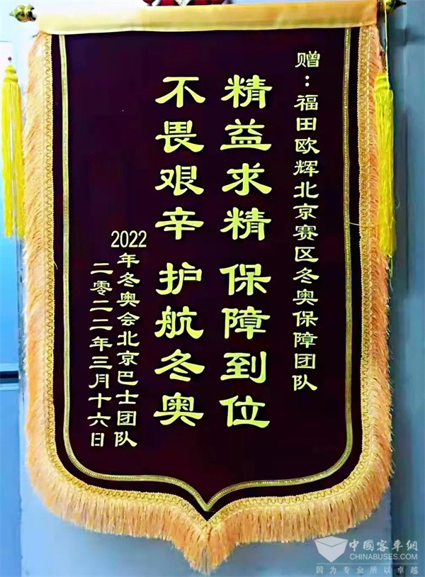 北京公交团队为欧辉服务保障团队送来“精益求精,保障到位,不畏艰辛,护航冬奥”的锦旗,对欧辉服务保障团队在护航冬奥中的敬业工作和工匠精神给予肯定和感谢。