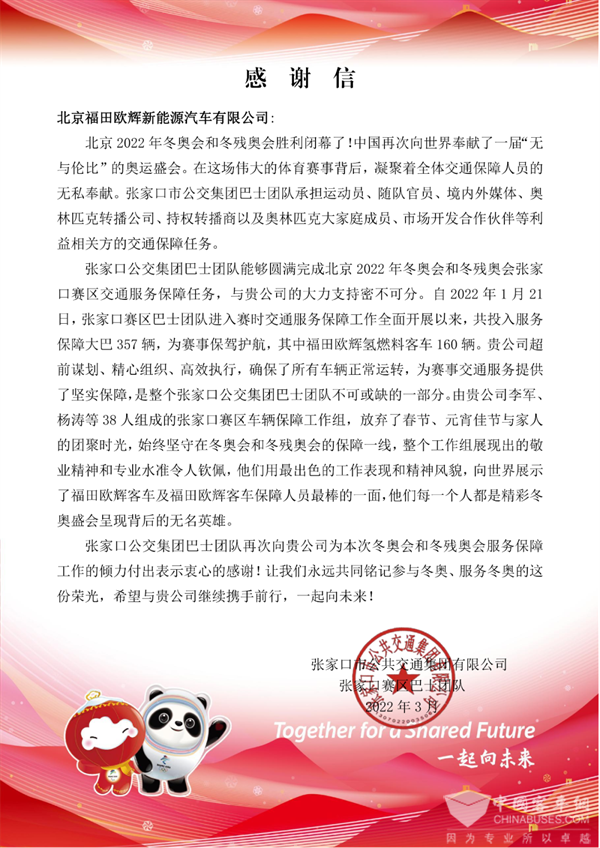 张家口市公共交通集团在感谢信中说:欧辉超前谋划、精心组织、高效执行,确保了所有车辆正常运转,为赛事交通服务提供了坚实保障,是整个张家口公交集团巴士团队不可或缺的一部分。欧辉服务保障团队展现出的敬业精神和专业水准令人钦佩,他们用最出色的工作表现和精神风貌,向世界展示了福田欧辉客车及福田欧辉客车保障人员最棒的一面,他们每一个人都是精彩冬奥盛会呈现背后的无名英雄。