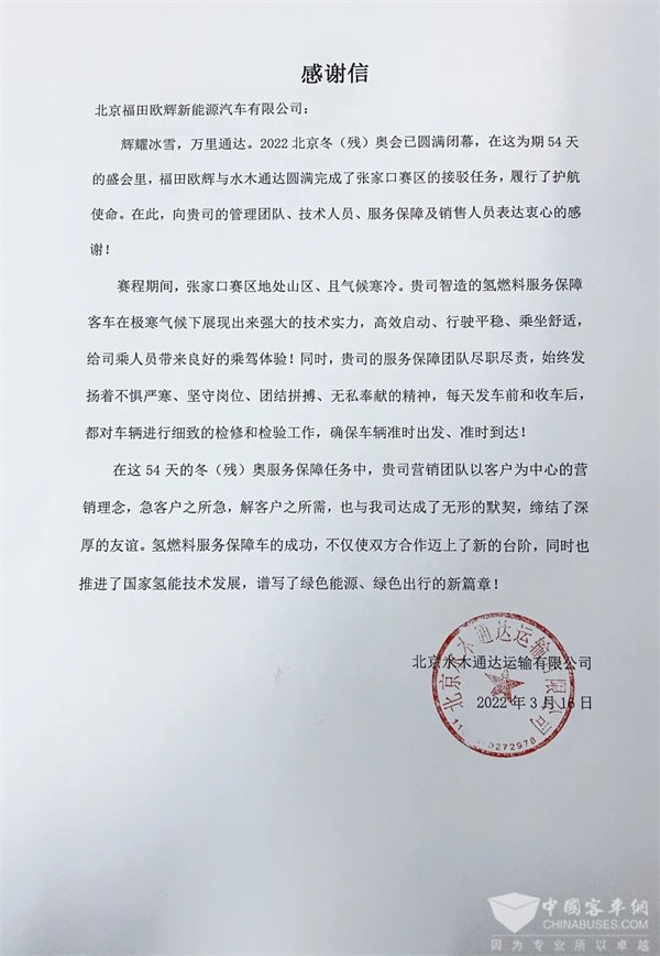 “福田欧辉服务保障团队尽职尽责,始终发扬着不惧严寒、坚守岗位、团结拼搏、无私奉献的精神”“感谢你为本次冬奥会和冬残奥会服务保障工作的倾力付出”“精益求精,保障到位,不畏艰辛,护航冬奥”“正是有了你们的辛苦付出,使车辆以高品质、零故障的状态保障了交通出行安全顺畅”“欧辉的氢燃料客车创下有史以来氢燃料客车服务国际级运动赛事规模最大、车型最多的记录。”......