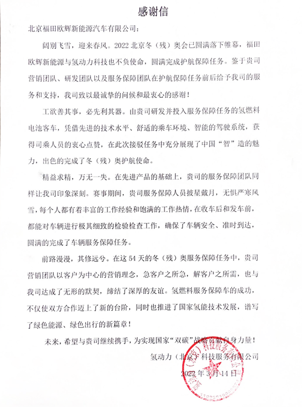 在本届冬奥会中,福田欧辉的氢燃料客车表现也极为抢眼,氢动力科技服务有限公司在感谢信中讲到:欧辉研发并投入服务保障任务的氢燃料电池客车,凭借先进的技术水平、舒适的乘车环境,智能的驾驶系统获得司乘人员的衷心点赞,在此次接驳任务中充分展现了中国“智”造的魅力,出色的完成了冬(残)奥护航使命。
