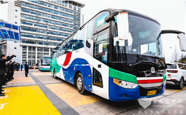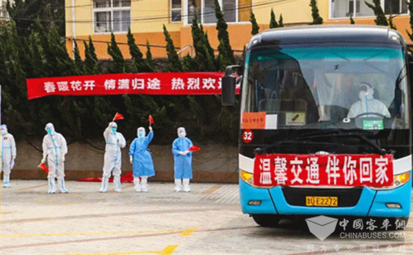 中通世轩旅团客车集结莱西,服务医护人员、志愿者出行,保障“回家行动”,运载解除隔离人员健康回家。