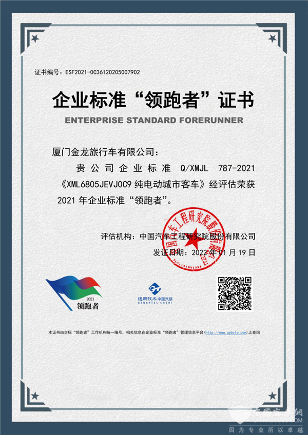 做标准化领跑,做品质化领跑!2022年3月31日,中国汽车行业高质量发展交流会暨“企业标准领跑者”发布会隆重举行。金旅客车凭借企业标准Q/XMJL 787-2021《XML6805JEVJ0C9纯电动城市客车》荣获国家2021年纯电动城市客车企业标准“领跑者”。这是对金旅在纯电动汽车领域技术实力的认可,更是对金旅在客车行业领跑者地位的认可。