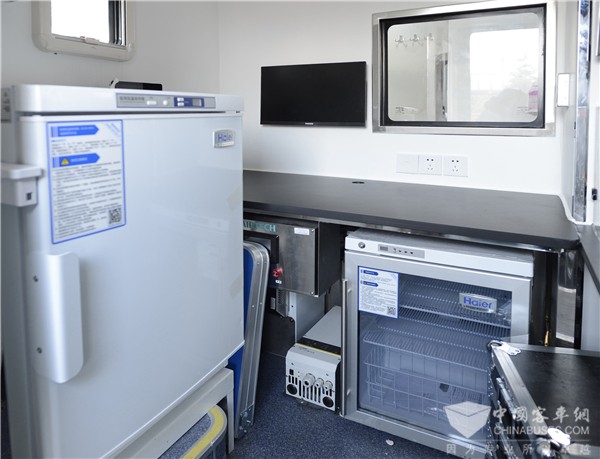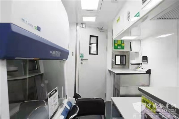 据介绍,这款海格12米移动核酸检测车,车内设置了“试剂准备”、”样本制备“、”扩增分析“三个工作区,配备管外杀菌、样本灭活,以及核酸提取、扩增、检测等专业设备,具备完成试剂准备、样本处理、核酸提取、核酸扩增检测、图谱分析、出具报告的全流程能力。