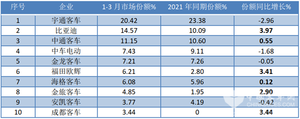 2022年1-3月TOP10企业6米以上新能源客车市场占有率及市占率变化(数据来源:中国客车统计信息网):