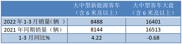 上表显示,2022年1-3月大中型新能源客车同比增长4.22%,跑赢2022年1-3月大中型客车-0.68%的增幅近4.9个百分点,成为抑制2022年1-3月大中型客车整体市场下滑的中坚力量。