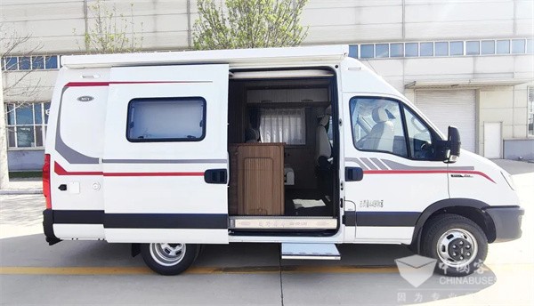 这款车基于依维柯欧胜底盘打造而成,整车长5995mm、宽2040mm、高2755mm。最大总质量4490Kg,额定载客4人。车身外部这款车窗使用外推窗,能使整车内部视野明亮,可以让车主更清楚地观察窗外的美丽景致。