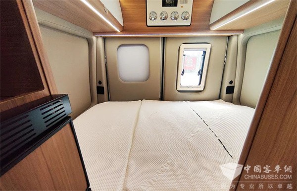 休息区采用纵置床设计,床铺尺寸为1.3*1.9m,可供两人休憩。环保记忆棉床垫的配备让车友睡眠更舒适。整车内部配有12V驻车专用空调、驻车燃油暖风机,保障出行时冬暖夏凉。