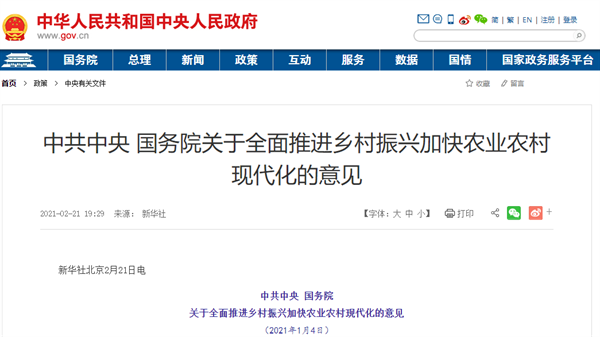 《中共中央 国务院关于全面推进乡村振兴加快农业农村现代化的意见》