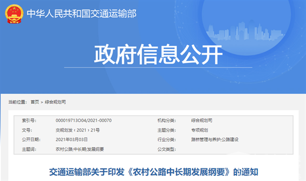 2021年3月25日,中共中央、国务院印发《关于实现巩固拓展脱贫攻坚成果同乡村振兴有效衔接的意见》 。《意见》强调要大力建设我国农村公路,并谋划建设一批高速公路,构建城乡交通一体化,推动乡村经济的全面振兴。