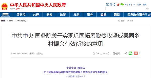 《关于实现巩固拓展脱贫攻坚成果同乡村振兴有效衔接的意见》