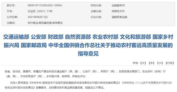 2021年2月21日,中央一号文件——《中共中央 国务院关于全面推进乡村振兴加快农业农村现代化的意见》后,其中强调要大力发展农村公路等基础设施,提高农村客运市场的质量。