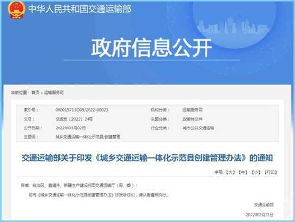2022年3月2日,交通运输部发布了《关于印发<城乡交通运输一体化示范县创建管理办法>的通知》(交运发〔2022〕24号,以下简称《管理办法》),这对进一步促进今年的农村(城乡)客运市场的高质量发展无疑利好。