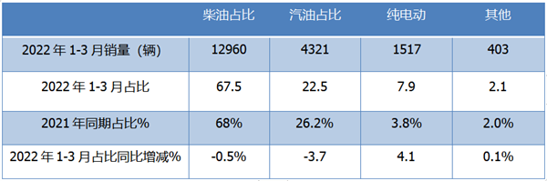 终端上牌数据显示,2022年1-3月及2021年同期,农村客运市场中销量占比最大的是柴油动力车型,其次为汽油。柴油占比近7成,且同比下降0.5个百分点;纯电动占比最小,但同比增加4.1个百分点,是占比增加最多的细分车型。
