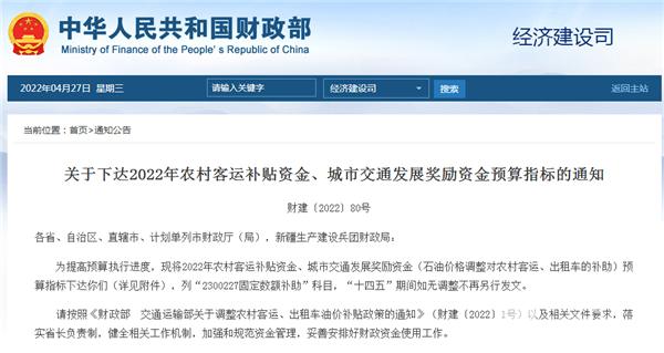 2022年4月20日,财政部下达《关于下达2022年农村客运补贴资金、城市交通发展奖励资金预算指标的通知》,通知中指出2022年将下达农村客运补贴资金和城市交通发展奖励资金241.862亿元。其中农村客运补贴资金100.2906亿元,城市交通发展奖励资金141.5714亿元,用于推动公共交通领域的车辆高质量、可持续发展。