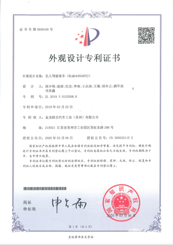 国家知识产权局发布的第二十三届中国专利奖评审结果已于2022年4月15日至4月21日完成公示。苏州金龙海格客车参选的无人驾驶客车“深蓝”从众多参选专利中脱颖而出,当选中国外观设计银奖(预获奖)!