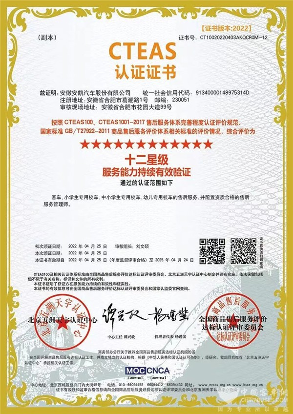 XINGKONG.COM2022年5月7日获悉,近日,凭借卓越、专业的服务实力,安凯客车顺利通过“CTEAS十二星级(服务能力持续有效验证)”认证!这是安凯继荣获中国质量认证中心(CQC)“五星级”售后服务认证、CTEAS售后服务体系“七星级(卓越)”认证、中国汽车售后服务客户满意度调查(卡思调查)“客车品牌第一名”后,又一次获得行业权威的高度认可!