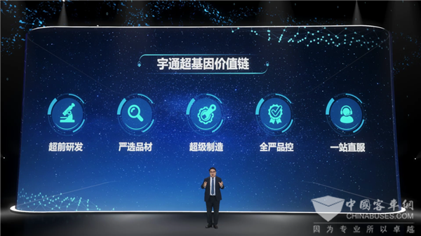 除了“超前研发”,在发布会上,宇通“超基因价值链”的另外四大核心模块也一一呈现,分别为“严选品材、超级制造、全严品控、一站直服”。