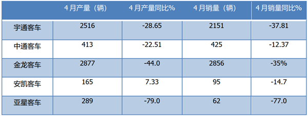 2022年4月客车五大上市公司客车产销及同比(数据来源:客车上市公司销量快报)