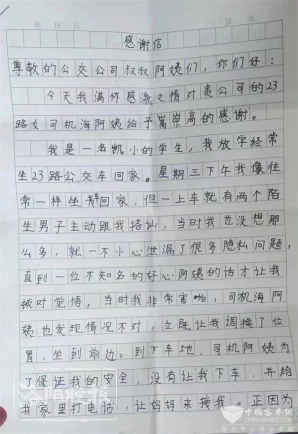 不久之后,一封感谢信送到了海亚娣手中。男孩用稚嫩的笔迹写道,“您是一位超赞的司机,因为有您,世界才能更美好”。