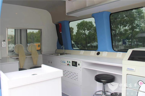 依维柯全科医疗车,采用非承载式专业底盘,整车配置齐全,内置豪华环保内饰,配备房车专用顶置空调,形成安全舒适的接种环境。整车分为前排驾驶室和后独立疫苗接种室两个部分,中门位置设置接种登记台,后独立接种室左侧为疫苗冷藏区。疫苗冷藏箱采用220V市电和车载逆变两处供电模式,保证电源不间断,确保疫苗安全有效。